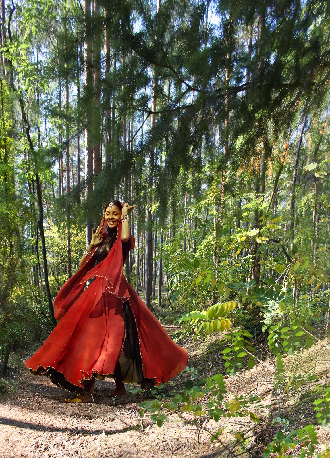 Die Tänzerin (Stockfoto) sollte in den von mir fotografierten Waldweg platziert werden.